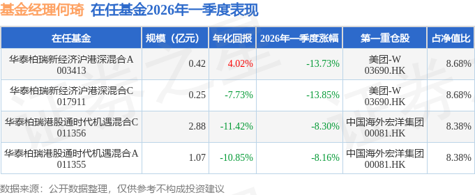 证券之星消息,日前华泰柏瑞港股通时代机遇混合A基金公布一季报,2026年一季度最新规模1.07亿元,季度净值涨幅为-8.16%。