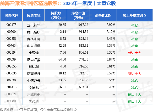 从基金规模来看,前海开源深圳特区精选股票C基金2026年一季度公布的基金规模为0.24亿元,较上一期规模9912.69万元变化了-7534.38万元,环比变化了-76.01%。该基金最新一期资产配置为:股票占净值比87.53%,债券占净值比6.51%,现金占净值比6.17%。从基金持仓来看,该基金当季前十大股票仓位达62.37%,第一大重仓股为立讯精密(002475),持仓占比为7.97%。