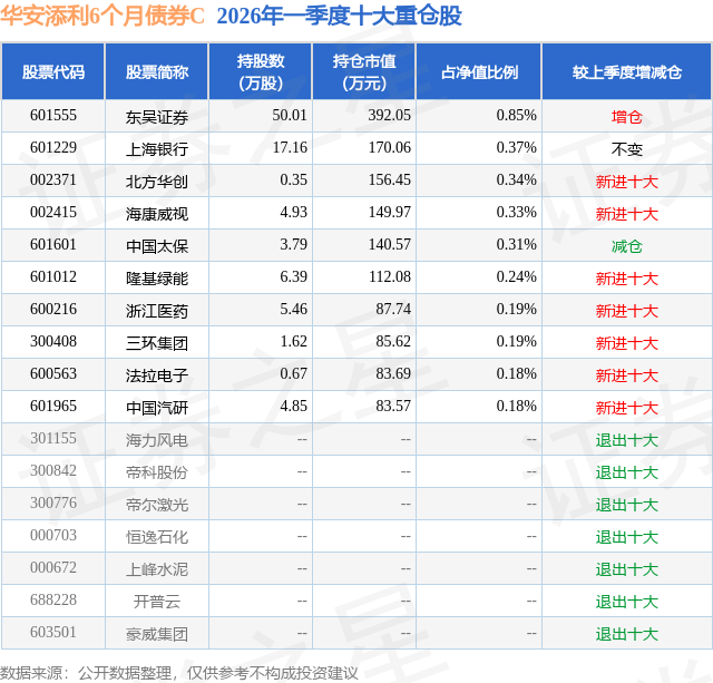 从基金规模来看,华安添利6个月债券C基金2026年一季度公布的基金规模为1.47亿元,较上一期规模1.14亿元变化了3279.29万元,环比变化了28.79%。该基金最新一期资产配置为:股票占净值比4.97%,债券占净值比87.08%,现金占净值比7.61%。从基金持仓来看,该基金当季前十大股票仓位达3.18%,第一大重仓股为东吴证券(601555),持仓占比为0.85%。