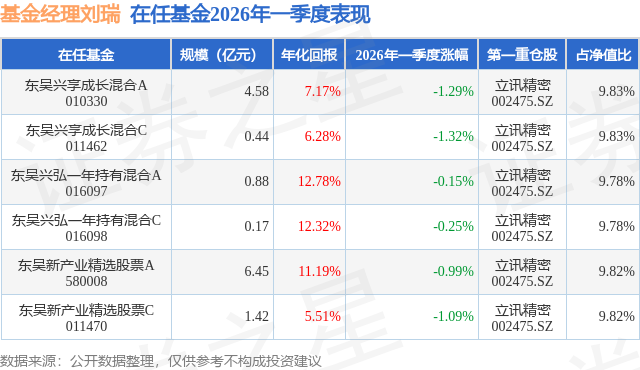 证券之星消息,日前东吴新产业精选股票C基金公布一季报,2026年一季度最新规模1.42亿元,季度净值涨幅为-1.09%。