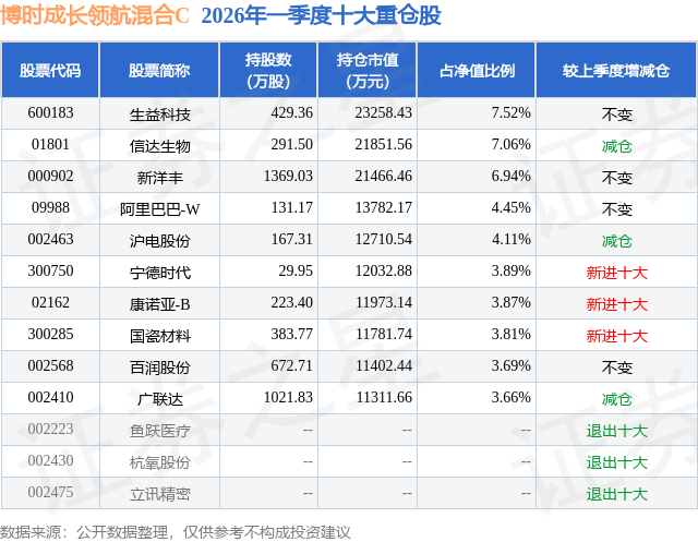 从基金规模来看,博时成长领航混合C基金2026年一季度公布的基金规模为3.9亿元,较上一期规模4.79亿元变化了-8912.84万元,环比变化了-18.61%。该基金最新一期资产配置为:股票占净值比87.54%,无债券类资产,现金占净值比11.54%。从基金持仓来看,该基金当季前十大股票仓位达49.0%,第一大重仓股为生益科技(600183),持仓占比为7.52%。