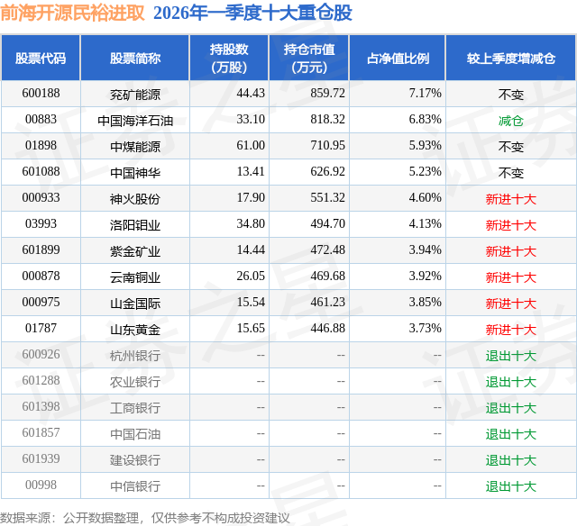 从基金规模来看,前海开源民裕进取基金2026年一季度公布的基金规模为1.2亿元,较上一期规模1.71亿元变化了-5151.74万元,环比变化了-30.06%。该基金最新一期资产配置为:股票占净值比68.5%,无债券类资产,现金占净值比31.78%。从基金持仓来看,该基金当季前十大股票仓位达49.33%,第一大重仓股为兖矿能源(600188),持仓占比为7.17%。