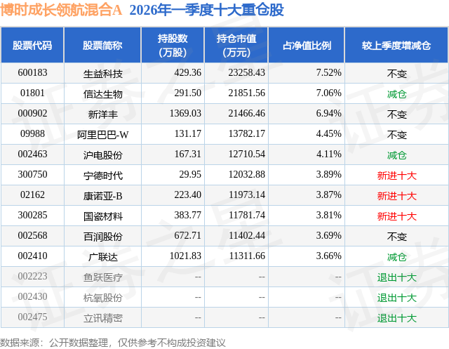 从基金规模来看,博时成长领航混合A基金2026年一季度公布的基金规模为27.04亿元,较上一期规模33.41亿元变化了-6.37亿元,环比变化了-19.06%。该基金最新一期资产配置为:股票占净值比87.54%,无债券类资产,现金占净值比11.54%。从基金持仓来看,该基金当季前十大股票仓位达49.0%,第一大重仓股为生益科技(600183),持仓占比为7.52%。