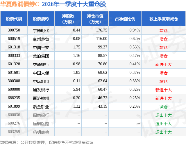 证券之星消息,日前华夏鼎润债券C基金公布一季报,2026年一季度最新规模0.43亿元,季度净值涨幅为0.01%。