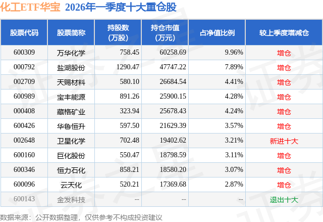 从基金规模来看,化工ETF华宝基金2026年一季度公布的基金规模为60.52亿元,较上一期规模37.93亿元变化了22.59亿元,环比变化了59.57%。该基金最新一期资产配置为:股票占净值比99.53%,无债券类资产,现金占净值比0.52%。从基金持仓来看,该基金当季前十大股票仓位达46.61%,第一大重仓股为万华化学(600309),持仓占比为9.96%。