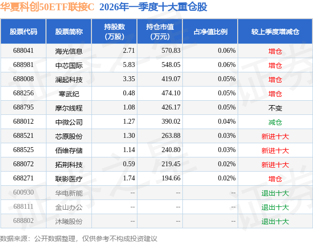 从基金规模来看,华夏科创50ETF联接C基金2026年一季度公布的基金规模为53.82亿元,较上一期规模72.73亿元变化了-18.91亿元,环比变化了-26.01%。该基金最新一期资产配置为:股票占净值比0.78%,债券占净值比0.11%,现金占净值比6.22%。从基金持仓来看,该基金当季前十大股票仓位达0.41%,第一大重仓股为海光信息(688041),持仓占比为0.06%。