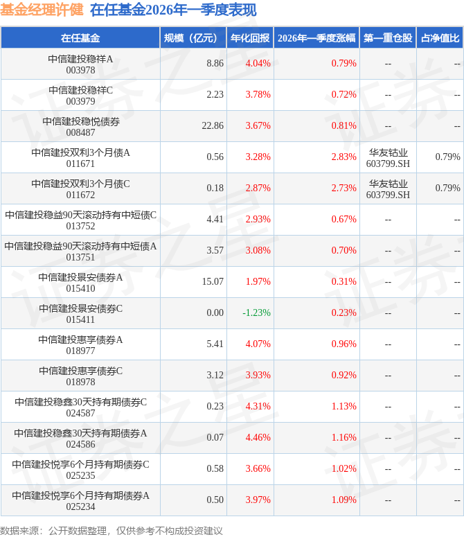 证券之星消息,日前中信建投双利3个月债C基金公布一季报,2026年一季度最新规模0.18亿元,季度净值涨幅为2.73%。
