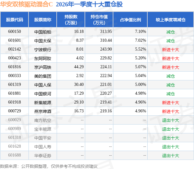 从基金规模来看,华安双核驱动混合C基金2026年一季度公布的基金规模为0.05亿元,较上一期规模191.52万元变化了320.71万元,环比变化了167.46%。该基金最新一期资产配置为:股票占净值比93.01%,无债券类资产,现金占净值比6.95%。从基金持仓来看,该基金当季前十大股票仓位达54.85%,第一大重仓股为中国船舶(600150),持仓占比为7.1%。