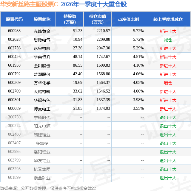 从基金规模来看,华安新丝路主题股票C基金2026年一季度公布的基金规模为0.02亿元,较上一期规模198.9万元变化了-24.46万元,环比变化了-12.3%。该基金最新一期资产配置为:股票占净值比90.15%,无债券类资产,现金占净值比10.4%。从基金持仓来看,该基金当季前十大股票仓位达45.04%,第一大重仓股为赤峰黄金(600988),持仓占比为5.72%。