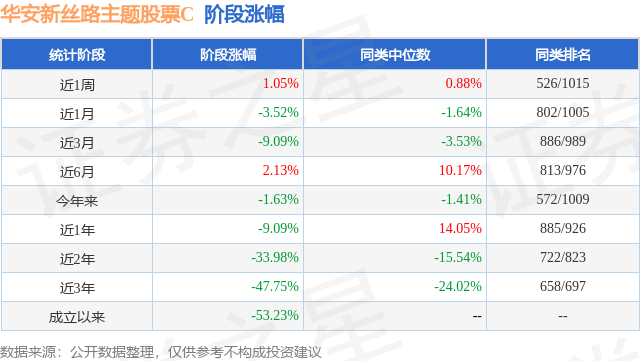 从业绩表现来看,华安新丝路主题股票C基金过去一年净值涨幅为32.38%,在同类基金中排名562/988,同类基金过去一年净值涨幅中位数为37.99%。而基金过去一年的最大回撤为-19.09%,成立以来的最大回撤为-58.98%。
