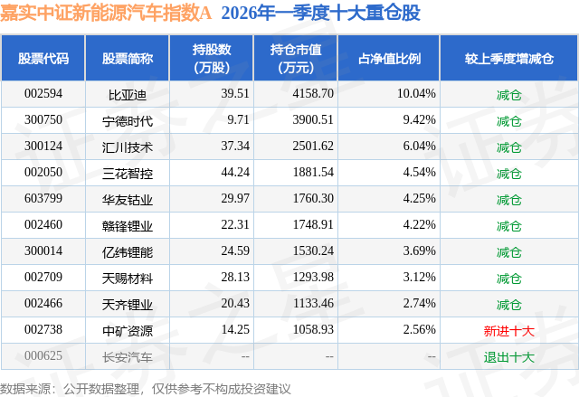 从基金规模来看,嘉实中证新能源汽车指数A基金2026年一季度公布的基金规模为0.57亿元,较上一期规模6298.13万元变化了-609.59万元,环比变化了-9.68%。该基金最新一期资产配置为:股票占净值比94.68%,债券占净值比1.3%,现金占净值比5.42%。从基金持仓来看,该基金当季前十大股票仓位达50.62%,第一大重仓股为比亚迪(002594),持仓占比为10.04%。