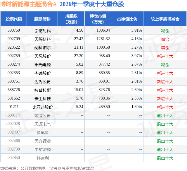从基金规模来看,博时新能源主题混合A基金2026年一季度公布的基金规模为1.44亿元,较上一期规模1.41亿元变化了300.79万元,环比变化了2.13%。该基金最新一期资产配置为:股票占净值比86.12%,无债券类资产,现金占净值比15.1%。从基金持仓来看,该基金当季前十大股票仓位达31.71%,第一大重仓股为宁德时代(300750),持仓占比为5.91%。
