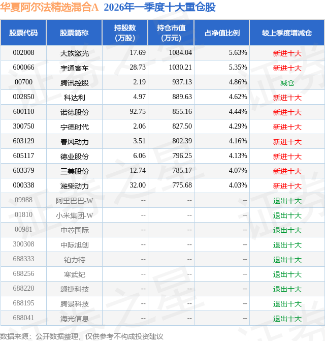 从基金规模来看,华夏阿尔法精选混合A基金2026年一季度公布的基金规模为1.75亿元,较上一期规模4.6亿元变化了-2.85亿元,环比变化了-61.91%。该基金最新一期资产配置为:股票占净值比92.05%,无债券类资产,现金占净值比8.33%。从基金持仓来看,该基金当季前十大股票仓位达45.58%,第一大重仓股为大族激光(002008),持仓占比为5.63%。