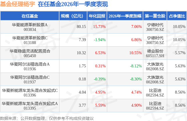 华夏阿尔法精选混合A现任基金经理为杨宇,本季度增聘基金经理杨宇,近期离任的基金经理为代瑞亮。其中在任基金经理杨宇已从业4年又221天,2026年2月10日正式接手管理华夏阿尔法精选混合A,任职期间累计回报为2.29%。目前还管理着7只基金产品(包括A类和C类),其中本季度表现最佳的基金为华夏稳盛灵活配置混合(005450),季度净值涨幅为10.55%。