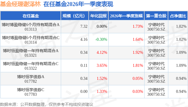 证券之星消息,日前博时恒盈稳健一年持有期混合C基金公布一季报,2026年一季度最新规模0.11亿元,季度净值涨幅为1.81%。