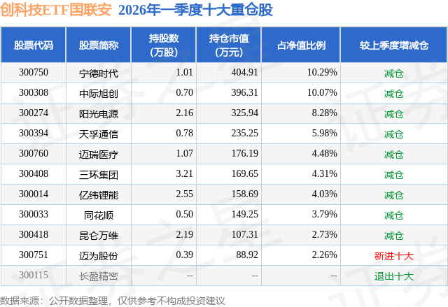 从基金规模来看,创科技ETF国联安基金2026年一季度公布的基金规模为0.39亿元,较上一期规模4458.62万元变化了-523.51万元,环比变化了-11.74%。该基金最新一期资产配置为:股票占净值比97.67%,无债券类资产,现金占净值比2.51%。从基金持仓来看,该基金当季前十大股票仓位达56.22%,第一大重仓股为宁德时代(300750),持仓占比为10.29%。