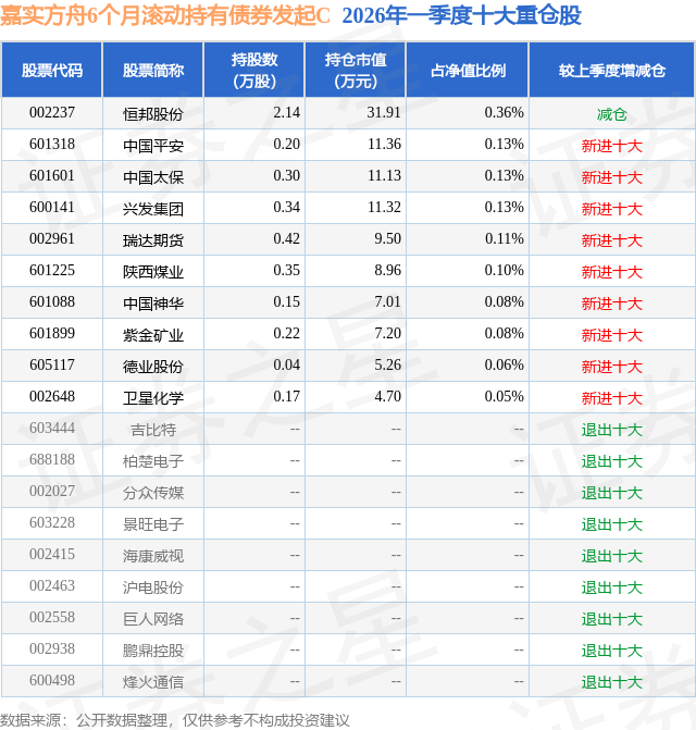 从基金规模来看,嘉实方舟6个月滚动持有债券发起C基金2026年一季度公布的基金规模为0.22亿元,较上一期规模2525.13万元变化了-307.86万元,环比变化了-12.19%。该基金最新一期资产配置为:股票占净值比3.02%,债券占净值比104.25%,现金占净值比2.06%。从基金持仓来看,该基金当季前十大股票仓位达1.23%,第一大重仓股为恒邦股份(002237),持仓占比为0.36%。