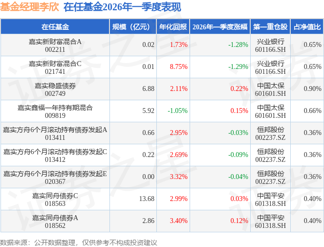 证券之星消息,日前嘉实方舟6个月滚动持有债券发起C基金公布一季报,2026年一季度最新规模0.22亿元,季度净值涨幅为-0.09%。