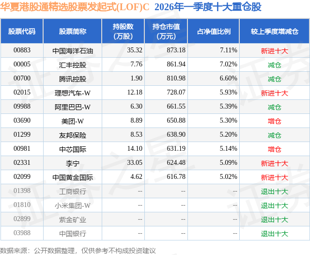 从基金规模来看,华夏港股通精选股票发起式(LOF)C基金2026年一季度公布的基金规模为0.07亿元,较上一期规模6312.01万元变化了-5578.32万元,环比变化了-88.38%。该基金最新一期资产配置为:股票占净值比85.77%,无债券类资产,现金占净值比13.31%。从基金持仓来看,该基金当季前十大股票仓位达57.8%,第一大重仓股为中国海洋石油(00883),持仓占比为7.11%。