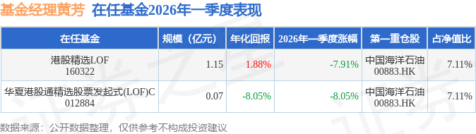 证券之星消息,日前华夏港股通精选股票发起式(LOF)C基金公布一季报,2026年一季度最新规模0.07亿元,季度净值涨幅为-8.05%。