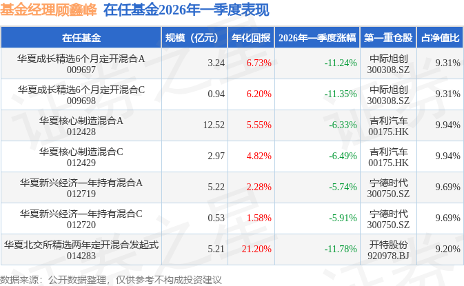 证券之星消息,日前华夏核心制造混合A基金公布一季报,2026年一季度最新规模12.52亿元,季度净值涨幅为-6.33%。
