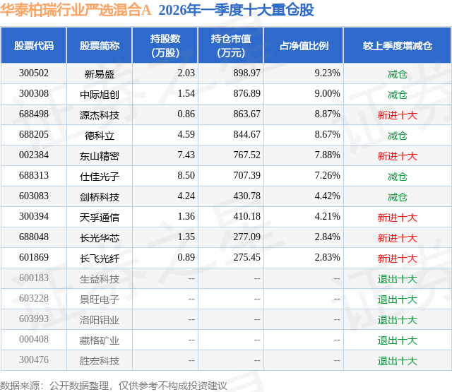 从基金规模来看,华泰柏瑞行业严选混合A基金2026年一季度公布的基金规模为0.78亿元,较上一期规模7403.23万元变化了391.35万元,环比变化了5.29%。该基金最新一期资产配置为:股票占净值比94.43%,无债券类资产,现金占净值比7.38%。从基金持仓来看,该基金当季前十大股票仓位达65.21%,第一大重仓股为新易盛(300502),持仓占比为9.23%。