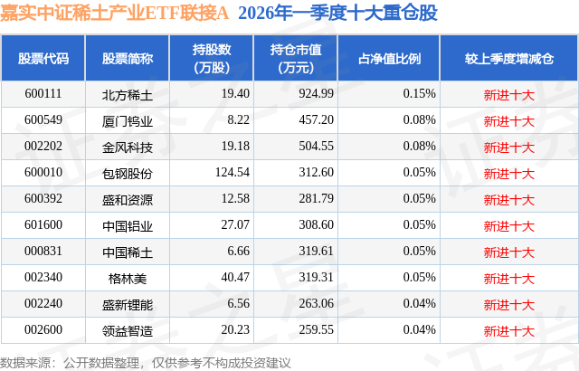 证券之星消息,日前嘉实中证稀土产业ETF联接A基金公布一季报,2026年一季度最新规模14.13亿元,季度净值涨幅为1.43%。