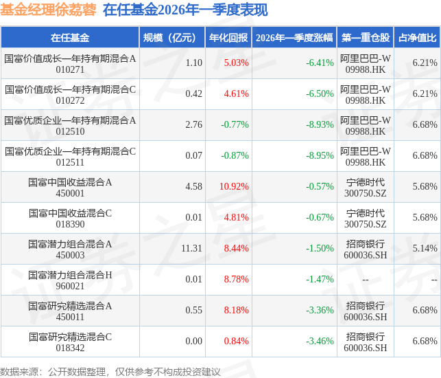 证券之星消息,日前国富优质企业一年持有期混合C基金公布一季报,2026年一季度最新规模0.07亿元,季度净值涨幅为-8.95%。
