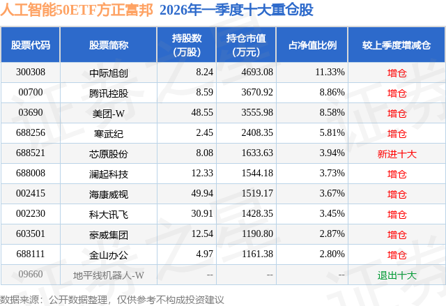 从基金规模来看,人工智能50ETF方正富邦基金2026年一季度公布的基金规模为4.14亿元,较上一期规模3.06亿元变化了1.09亿元,环比变化了35.61%。该基金最新一期资产配置为:股票占净值比98.72%,无债券类资产,现金占净值比1.43%。从基金持仓来看,该基金当季前十大股票仓位达55.04%,第一大重仓股为中际旭创(300308),持仓占比为11.33%。