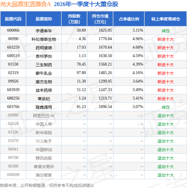 从基金规模来看,光大品质生活混合A基金2026年一季度公布的基金规模为3.48亿元,较上一期规模4.84亿元变化了-1.36亿元,环比变化了-28.11%。该基金最新一期资产配置为:股票占净值比83.01%,债券占净值比6.44%,现金占净值比12.23%。从基金持仓来看,该基金当季前十大股票仓位达41.5%,第一大重仓股为宇通客车(600066),持仓占比为5.11%。