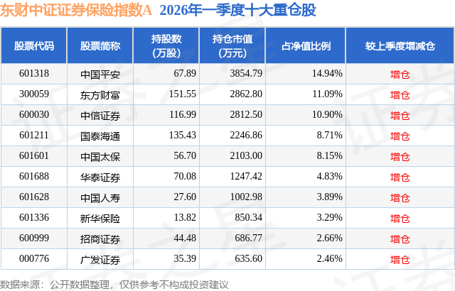 从基金规模来看,东财中证证券保险指数A基金2026年一季度公布的基金规模为1.02亿元,较上一期规模1.47亿元变化了-4490.78万元,环比变化了-30.53%。该基金最新一期资产配置为:股票占净值比94.99%,无债券类资产,现金占净值比5.54%。从基金持仓来看,该基金当季前十大股票仓位达70.92%,第一大重仓股为中国平安(601318),持仓占比为14.94%。