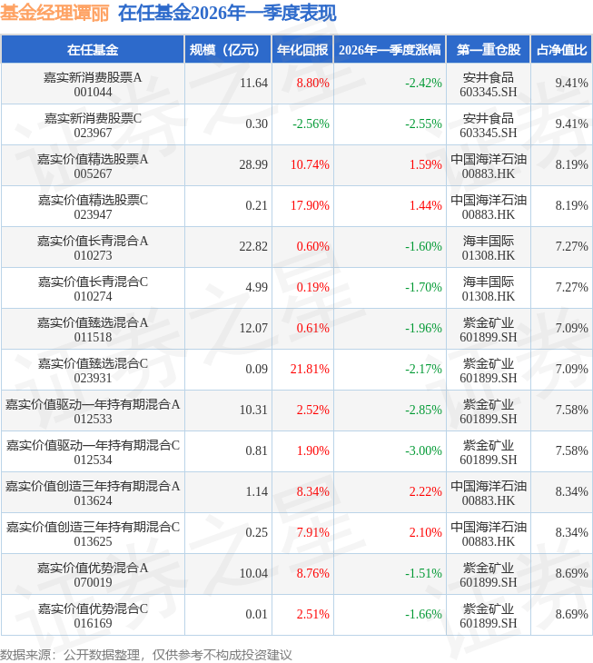 从基金规模来看,嘉实价值驱动一年持有期混合C基金2026年一季度公布的基金规模为0.81亿元,较上一期规模1.86亿元变化了-1.05亿元,环比变化了-56.3%。该基金最新一期资产配置为:股票占净值比93.82%,无债券类资产,现金占净值比6.66%。从基金持仓来看,该基金当季前十大股票仓位达58.74%,第一大重仓股为紫金矿业(601899),持仓占比为7.58%。