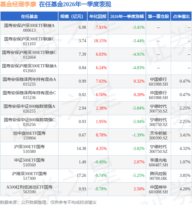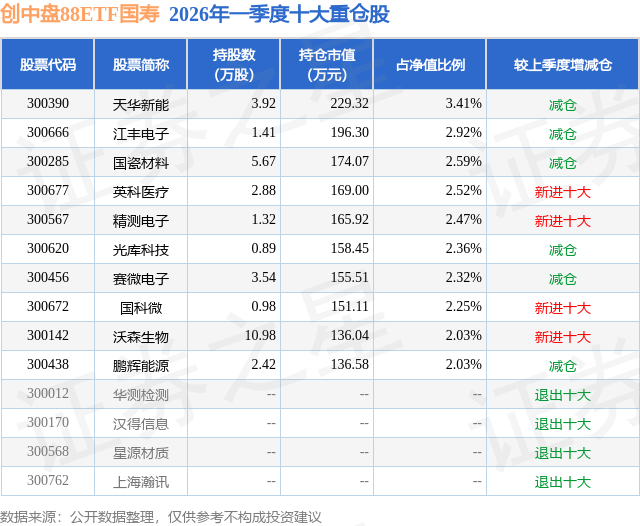 从基金规模来看,创中盘88ETF国寿基金2026年一季度公布的基金规模为0.67亿元,较上一期规模1.39亿元变化了-7216.93万元,环比变化了-51.8%。该基金最新一期资产配置为:股票占净值比98.61%,无债券类资产,现金占净值比1.42%。从基金持仓来看,该基金当季前十大股票仓位达24.9%,第一大重仓股为天华新能(300390),持仓占比为3.41%。