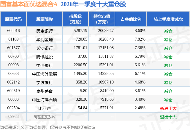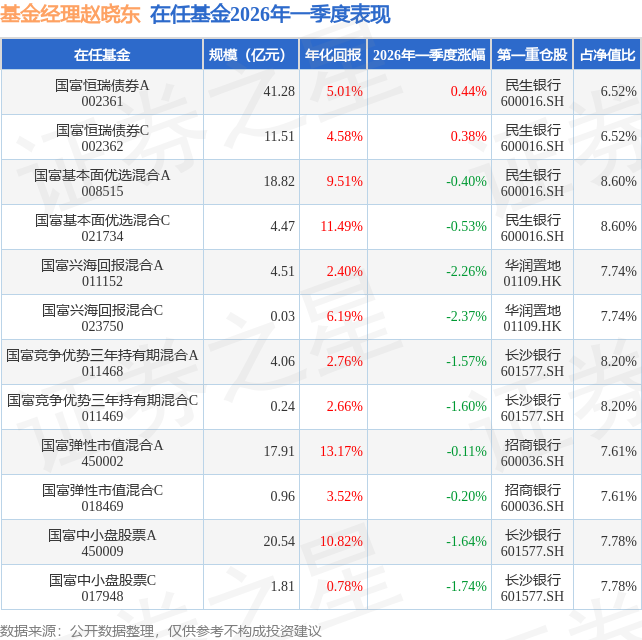 从基金规模来看,国富基本面优选混合A基金2026年一季度公布的基金规模为18.82亿元,较上一期规模26.34亿元变化了-7.52亿元,环比变化了-28.54%。该基金最新一期资产配置为:股票占净值比88.7%,债券占净值比5.66%,现金占净值比5.85%。从基金持仓来看,该基金当季前十大股票仓位达57.46%,第一大重仓股为民生银行(600016),持仓占比为8.6%。