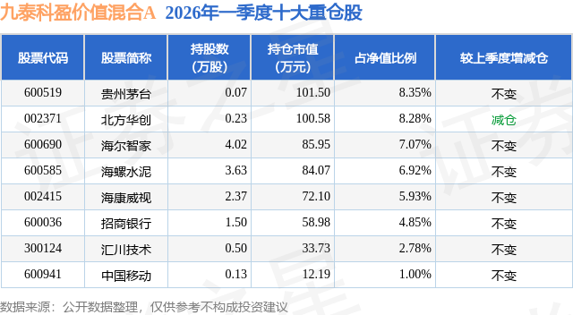 从基金规模来看,九泰科盈价值混合A基金2026年一季度公布的基金规模为0.09亿元,较上一期规模937.48万元变化了-74.33万元,环比变化了-7.93%。该基金最新一期资产配置为:股票占净值比45.19%,债券占净值比51.02%,现金占净值比0.9%。从基金持仓来看,该基金当季前十大股票仓位达45.18%,第一大重仓股为贵州茅台(600519),持仓占比为8.35%。