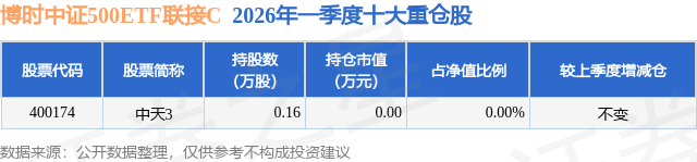 从基金规模来看,博时中证500ETF联接C基金2026年一季度公布的基金规模为2.05亿元,较上一期规模3.52亿元变化了-1.46亿元,环比变化了-41.64%。该基金最新一期资产配置为:无股票类资产,无债券类资产,现金占净值比7.89%。从基金持仓来看,该基金当季前十大股票仓位达0.0%,第一大重仓股为中天3(400174),持仓占比为0.0%。