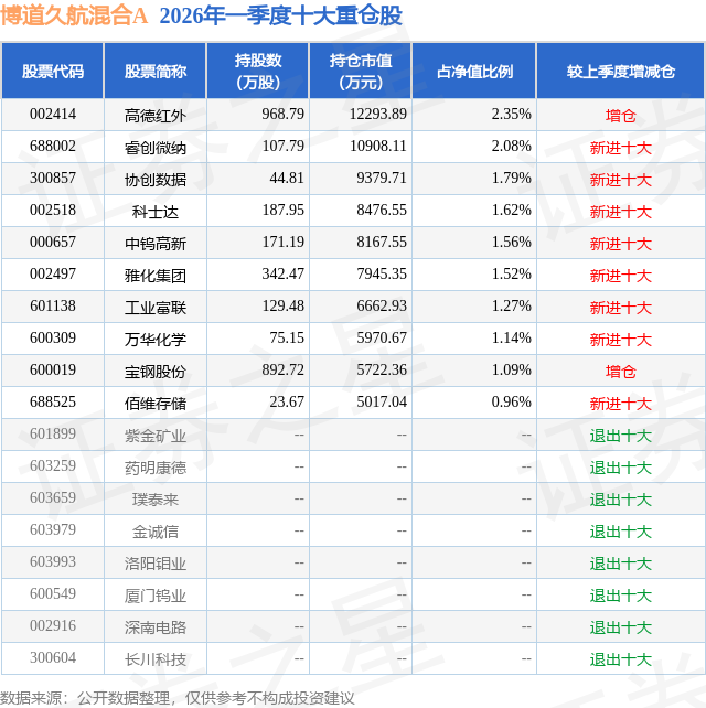 从基金规模来看,博道久航混合A基金2026年一季度公布的基金规模为20.97亿元,较上一期规模2.22亿元变化了18.75亿元,环比变化了842.66%。该基金最新一期资产配置为:股票占净值比88.66%,债券占净值比5.56%,现金占净值比6.48%。从基金持仓来看,该基金当季前十大股票仓位达15.38%,第一大重仓股为高德红外(002414),持仓占比为2.35%。