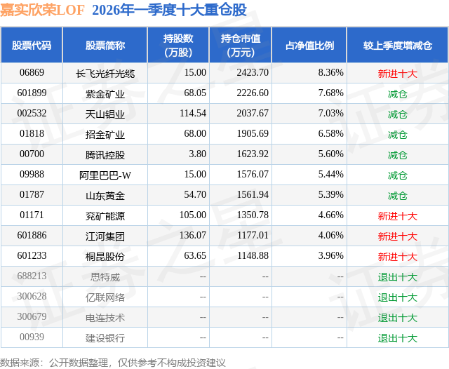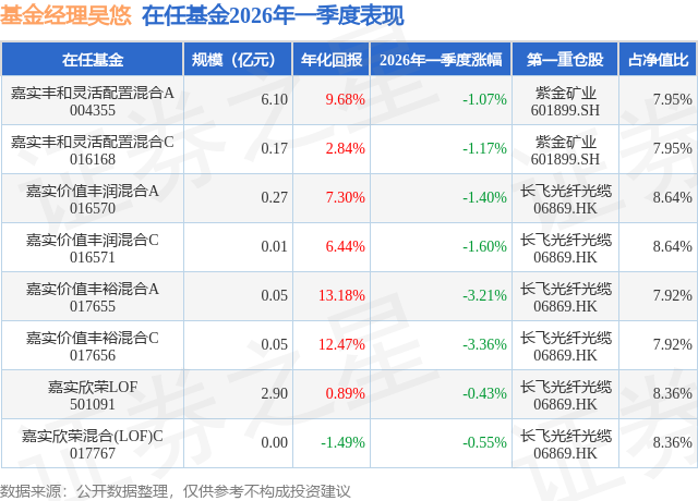从基金规模来看,嘉实欣荣LOF基金2026年一季度公布的基金规模为2.9亿元,较上一期规模4.36亿元变化了-1.46亿元,环比变化了-33.55%。该基金最新一期资产配置为:股票占净值比87.49%,债券占净值比1.74%,现金占净值比8.59%。从基金持仓来看,该基金当季前十大股票仓位达58.76%,第一大重仓股为长飞光纤光缆(06869),持仓占比为8.36%。