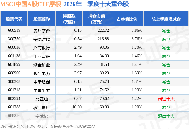 从基金规模来看,MSCI中国A股ETF摩根基金2026年一季度公布的基金规模为0.58亿元,较上一期规模6816.67万元变化了-1050.29万元,环比变化了-15.41%。该基金最新一期资产配置为:股票占净值比99.72%,无债券类资产,现金占净值比0.52%。从基金持仓来看,该基金当季前十大股票仓位达18.6%,第一大重仓股为贵州茅台(600519),持仓占比为3.86%。