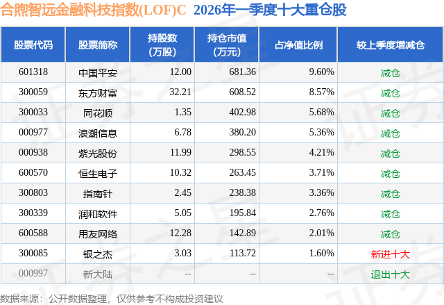从基金规模来看,合煦智远金融科技指数(LOF)C基金2026年一季度公布的基金规模为0.26亿元,较上一期规模6768.91万元变化了-4155.7万元,环比变化了-61.39%。该基金最新一期资产配置为:股票占净值比92.61%,无债券类资产,现金占净值比7.9%。从基金持仓来看,该基金当季前十大股票仓位达46.86%,第一大重仓股为中国平安(601318),持仓占比为9.6%。