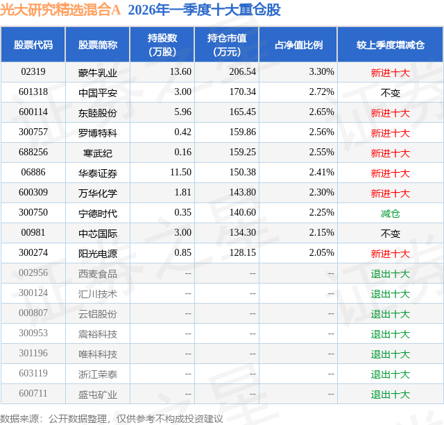 从基金规模来看,光大研究精选混合A基金2026年一季度公布的基金规模为0.63亿元,较上一期规模7009.85万元变化了-758.61万元,环比变化了-10.82%。该基金最新一期资产配置为:股票占净值比92.66%,债券占净值比6.61%,现金占净值比1.13%。从基金持仓来看,该基金当季前十大股票仓位达24.94%,第一大重仓股为蒙牛乳业(02319),持仓占比为3.3%。