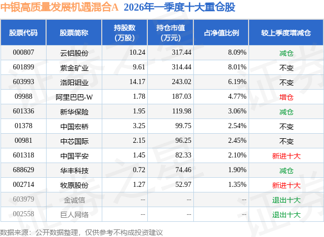 从基金规模来看,中银高质量发展机遇混合A基金2026年一季度公布的基金规模为0.24亿元,较上一期规模4841.3万元变化了-2399.17万元,环比变化了-49.56%。该基金最新一期资产配置为:股票占净值比88.96%,债券占净值比7.49%,现金占净值比3.3%。从基金持仓来看,该基金当季前十大股票仓位达40.46%,第一大重仓股为云铝股份(000807),持仓占比为8.09%。