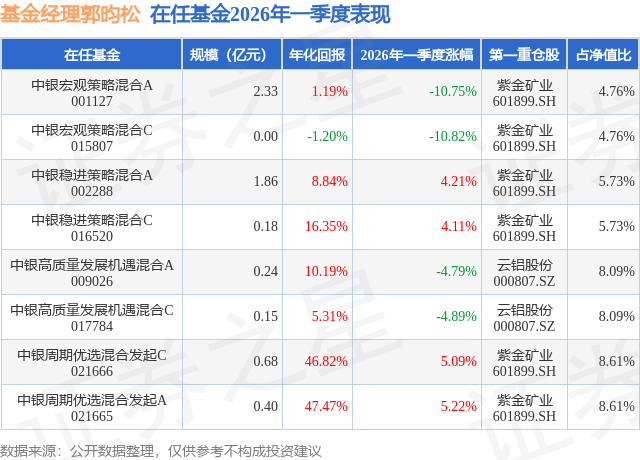 证券之星消息,日前中银高质量发展机遇混合A基金公布一季报,2026年一季度最新规模0.24亿元,季度净值涨幅为-4.79%。