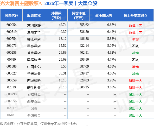 从基金规模来看,光大消费主题股票A基金2026年一季度公布的基金规模为0.69亿元,较上一期规模1.84亿元变化了-1.16亿元,环比变化了-62.67%。该基金最新一期资产配置为:股票占净值比89.64%,债券占净值比7.24%,现金占净值比3.74%。从基金持仓来看,该基金当季前十大股票仓位达49.83%,第一大重仓股为黄山旅游(600054),持仓占比为6.65%。