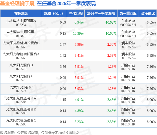 证券之星消息,日前光大消费主题股票A基金公布一季报,2026年一季度最新规模0.69亿元,季度净值涨幅为-10.62%。