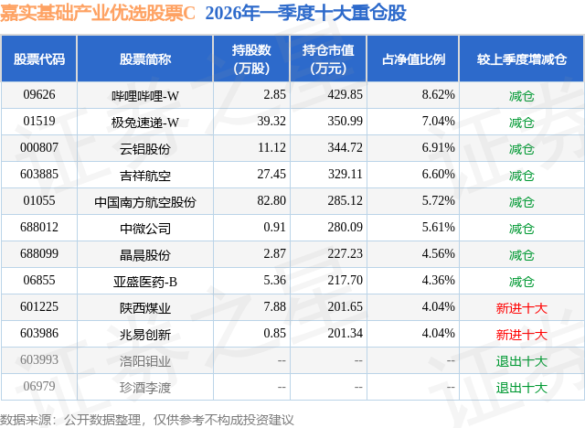 从基金规模来看,嘉实基础产业优选股票C基金2026年一季度公布的基金规模为0.07亿元,较上一期规模816.86万元变化了-141.9万元,环比变化了-17.37%。该基金最新一期资产配置为:股票占净值比93.47%,债券占净值比1.82%,现金占净值比4.03%。从基金持仓来看,该基金当季前十大股票仓位达57.5%,第一大重仓股为哔哩哔哩-W(09626),持仓占比为8.62%。