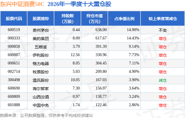 从基金规模来看,东兴中证消费50C基金2026年一季度公布的基金规模为0.18亿元,较上一期规模2481.13万元变化了-671.45万元,环比变化了-27.06%。该基金最新一期资产配置为:股票占净值比94.31%,债券占净值比5.65%,现金占净值比0.35%。从基金持仓来看,该基金当季前十大股票仓位达71.85%,第一大重仓股为贵州茅台(600519),持仓占比为14.9%。