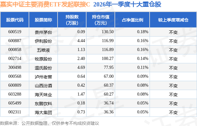 从基金规模来看,嘉实中证主要消费ETF发起联接C基金2026年一季度公布的基金规模为5.19亿元,较上一期规模2.35亿元变化了2.84亿元,环比变化了120.87%。该基金最新一期资产配置为:股票占净值比1.63%,债券占净值比0.07%,现金占净值比5.49%。从基金持仓来看,该基金当季前十大股票仓位达1.1%,第一大重仓股为贵州茅台(600519),持仓占比为0.18%。