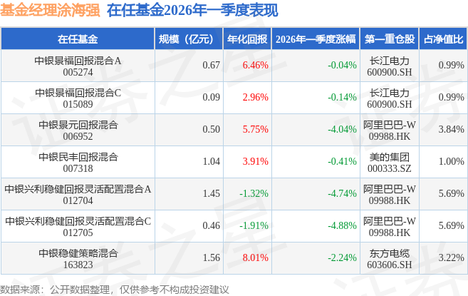 证券之星消息,日前中银民丰回报混合基金公布一季报,2026年一季度最新规模1.04亿元,季度净值涨幅为-0.41%。