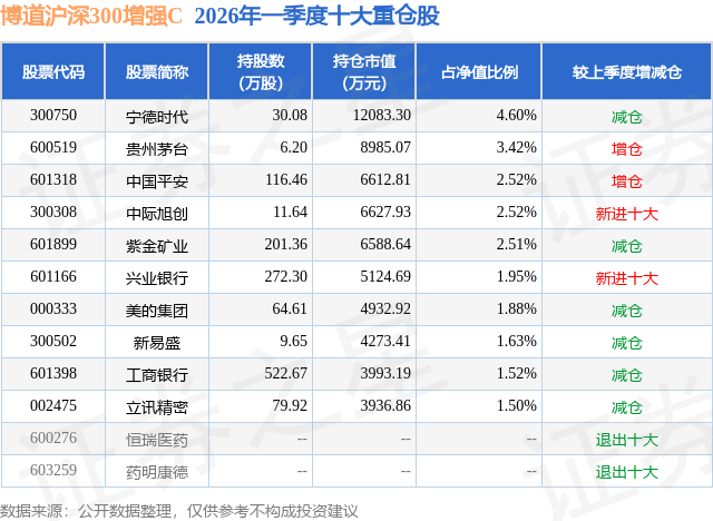 从基金规模来看,博道沪深300增强C基金2026年一季度公布的基金规模为13.54亿元,较上一期规模7.88亿元变化了5.66亿元,环比变化了71.79%。该基金最新一期资产配置为:股票占净值比93.98%,债券占净值比5.18%,现金占净值比2.47%。从基金持仓来看,该基金当季前十大股票仓位达24.05%,第一大重仓股为宁德时代(300750),持仓占比为4.6%。